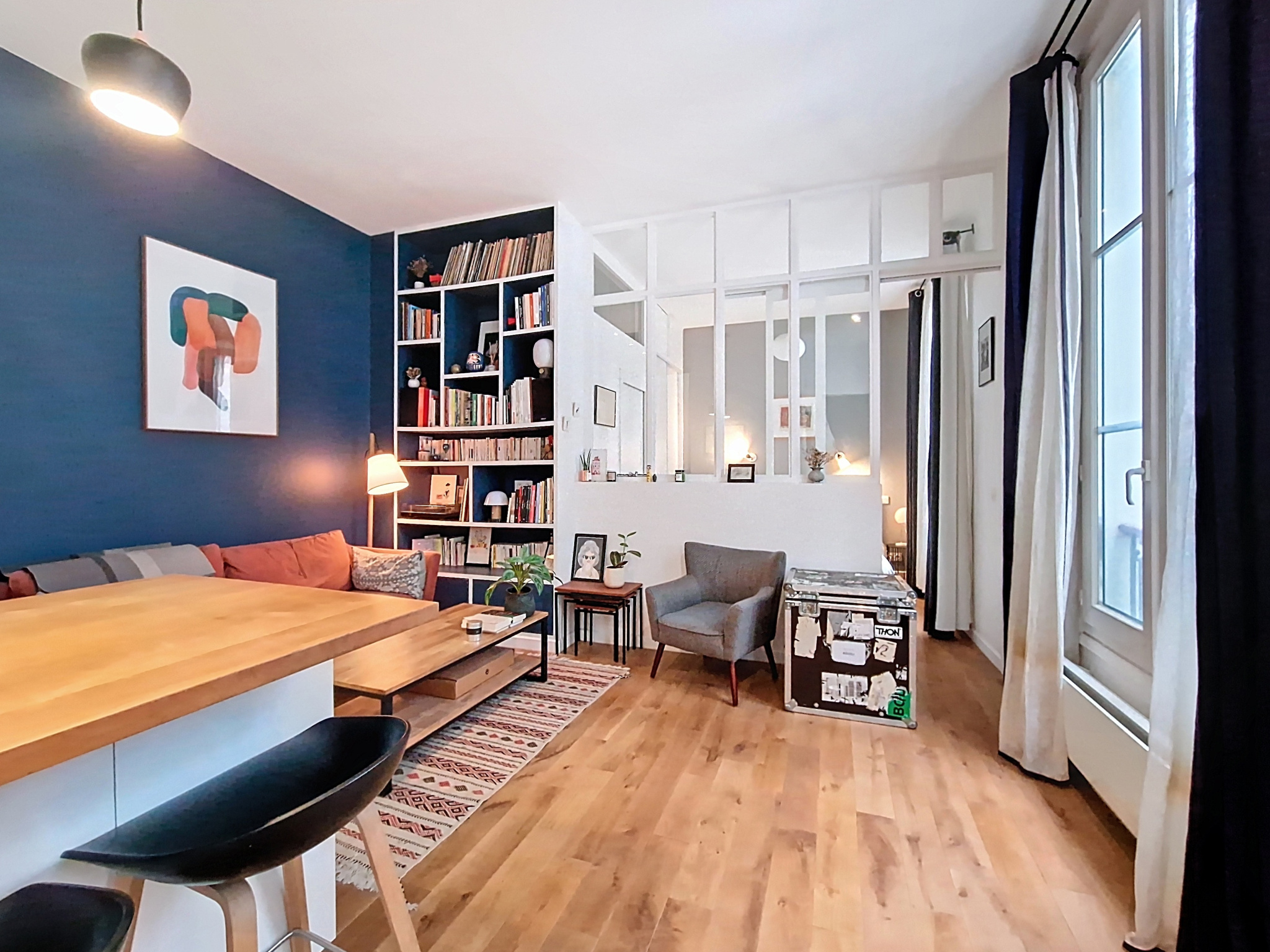 Il se compose d'un séjour, d'une cuisine ouverte aménagée et équipée, d'une chambre avec dressing et d'une salle d'eau avec WC. Le tout en très bon état : un vrai petit cocon dans ce quartier recherché du 10ème arrondissement.