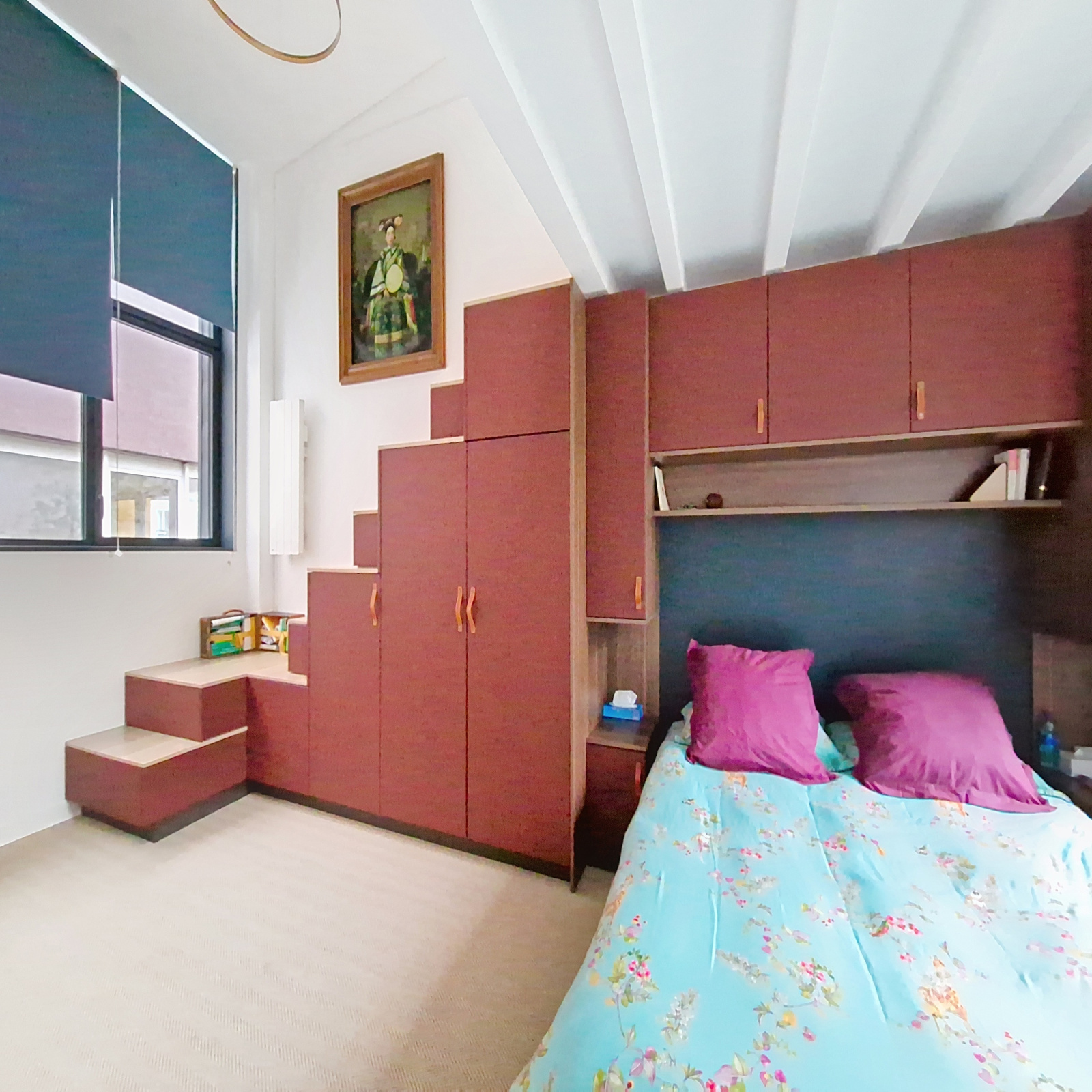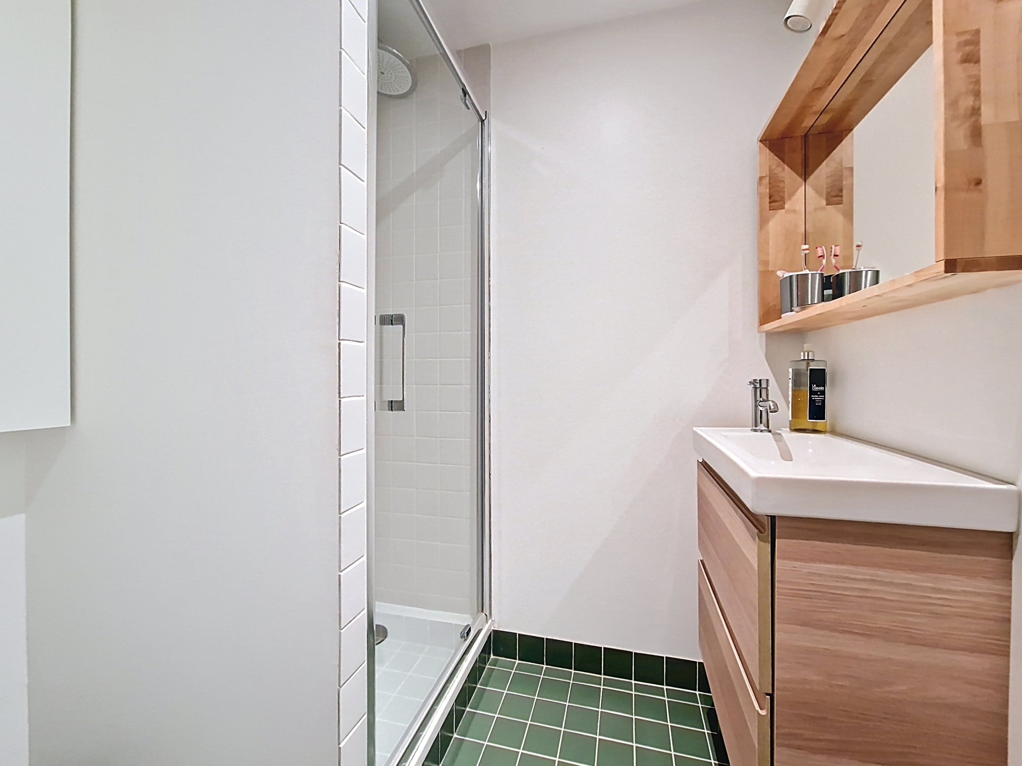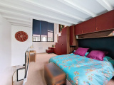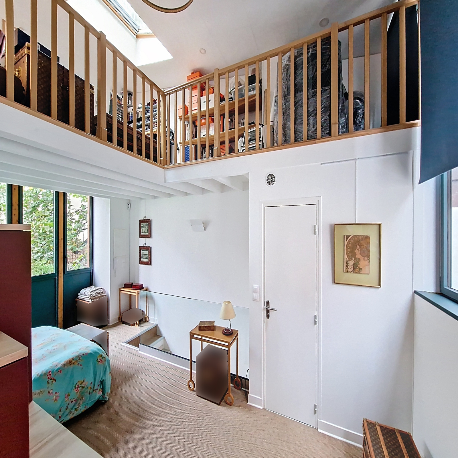 À l’étage supérieur, accessible par un superbe escalier en béton, se trouve une chambre en double exposition, dotée de rangements sur mesure et d’une salle d’eau avec WC. Une mezzanine peut accueillir un espace de travail ou un coin lecture.