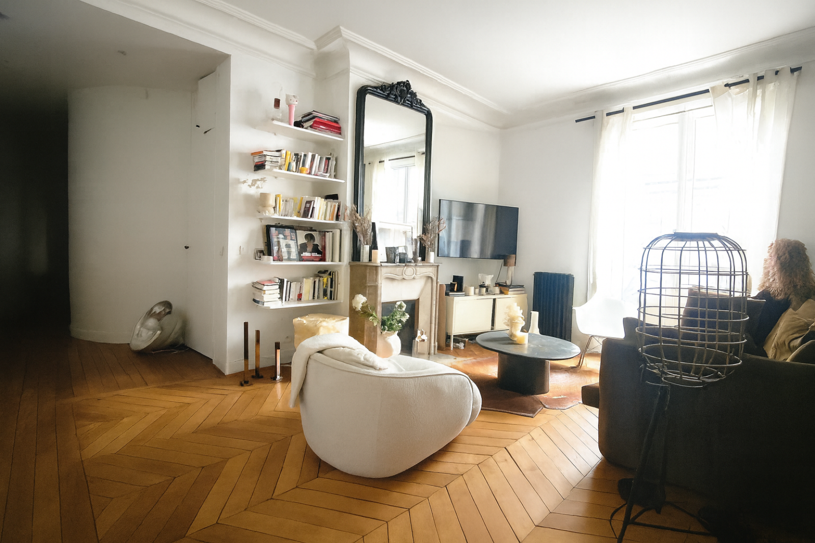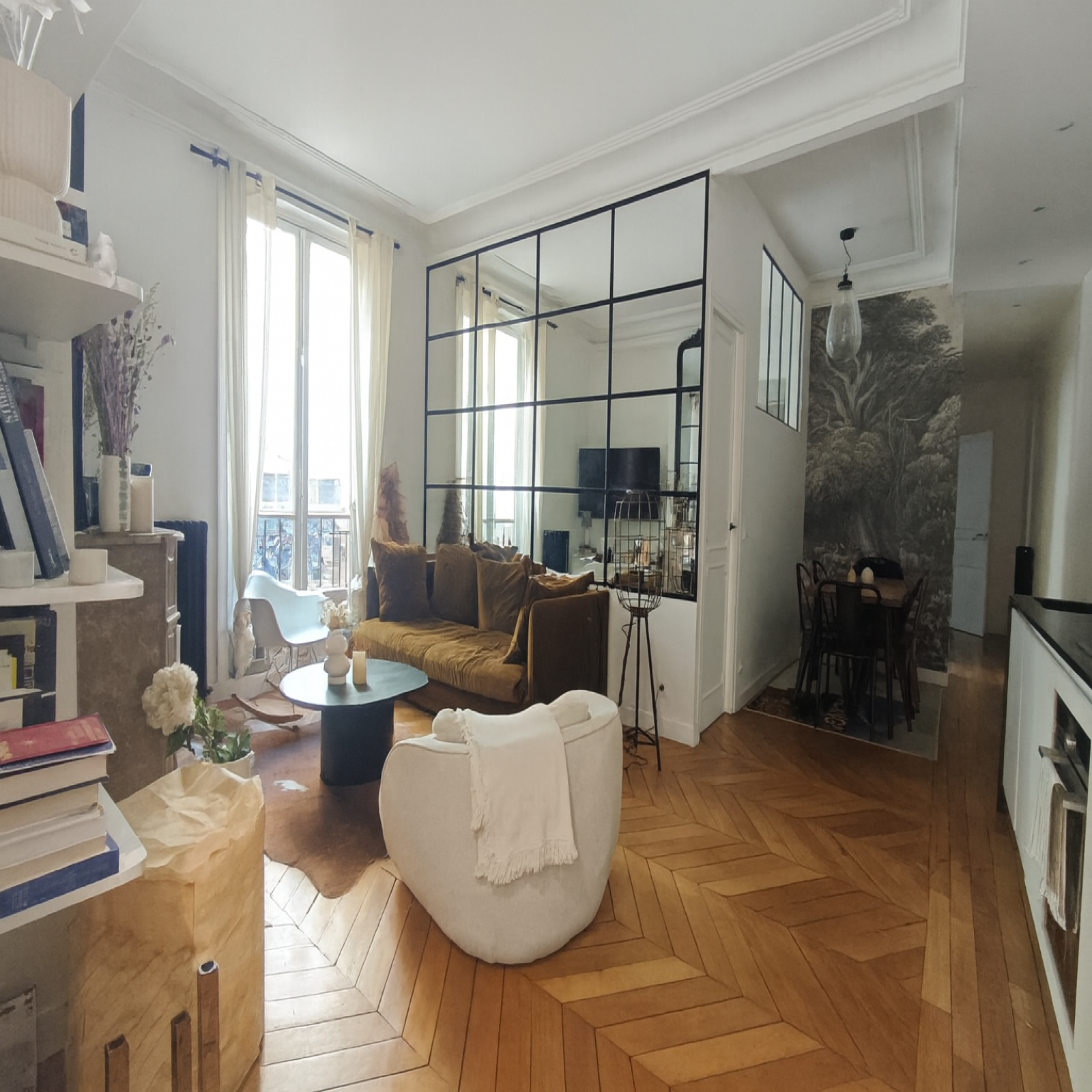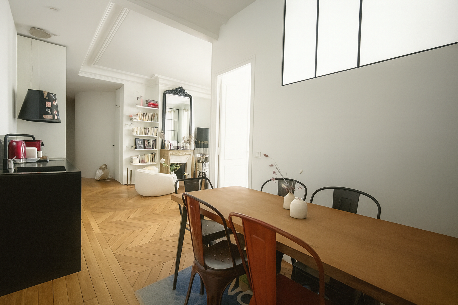 L’entrée dessert un séjour lumineux, mettant en valeur un parquet en point de Hongrie et une verrière atelier qui structure l’espace et apporte du caractère. La cuisine ouverte s’intègre harmonieusement à la pièce de vie, créant un ensemble convivial et fonctionnel.